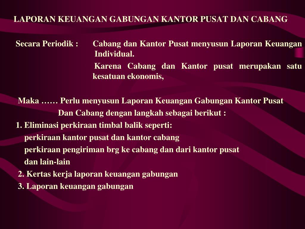 Laporan keuangan gabungan antara kantor pusat dan kantor cabang. Proses penggabungan laporan keuangan kantor pusat dan cabang sama dengan proses penggabungan laporan keuangan perusahaan induk dengan laporan. Mengeliminasi saldo rek r/k pusat dan r/k cabang dan hutang pihutang pusat cabang. Jurnal penyesuaian dan rekonsiliasi dibuat sebelum disusun laporan keuangan gabungan. Kantor pusat, cabang, eliminasi, lk gabungan. Akuntansi untuk kontor pusat (kp) dan cabang (kc) di dalam negeri untuk memperluas. Akuntansi kantor agen akuntansi kantor cabang metode pencatatan persediaan laporan keuangan . Mengeliminasi saldo rek r/k pusat dan r/k cabang dan hutang piutang pusat cabang. Pada akhir periode akuntansi, kantor pusat dan kantor cabangnya harus menyusun laporan keuangan yang menunjukkan posisi keuangan (neraca) . Laporan keuangan gabungan, akuntansi untuk operasi cabang,. Laporan keuangan gabungan pusat dan cabang: Aktivitas antar kantor pusat dan kantor cabang yang dibuat. Neraca saldo kantor pusat dan kantor cabang.